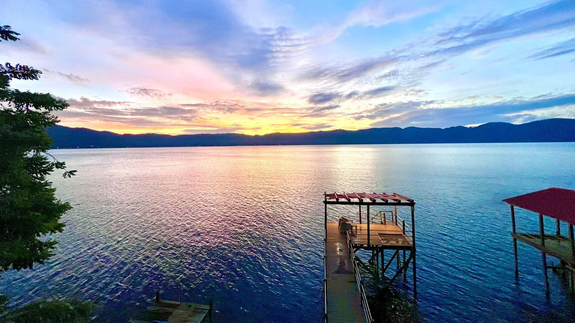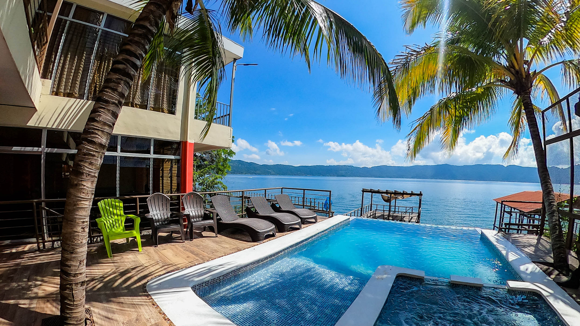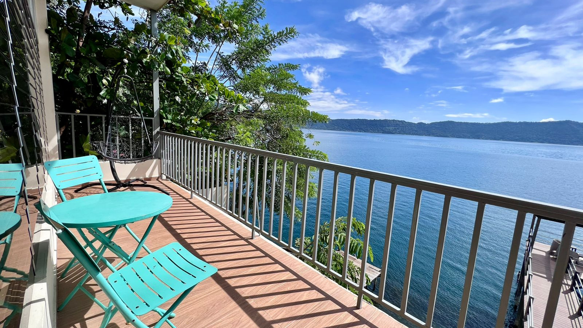 Acogedora casa en el Lago de Coatepeque, Quinta Sunset cuenta con una espectacular vista al lago desde sus terrazas. Además, tiene tres habitaciones y una cabaña. La habitación principal tiene vista al lago y dentro de la casa: