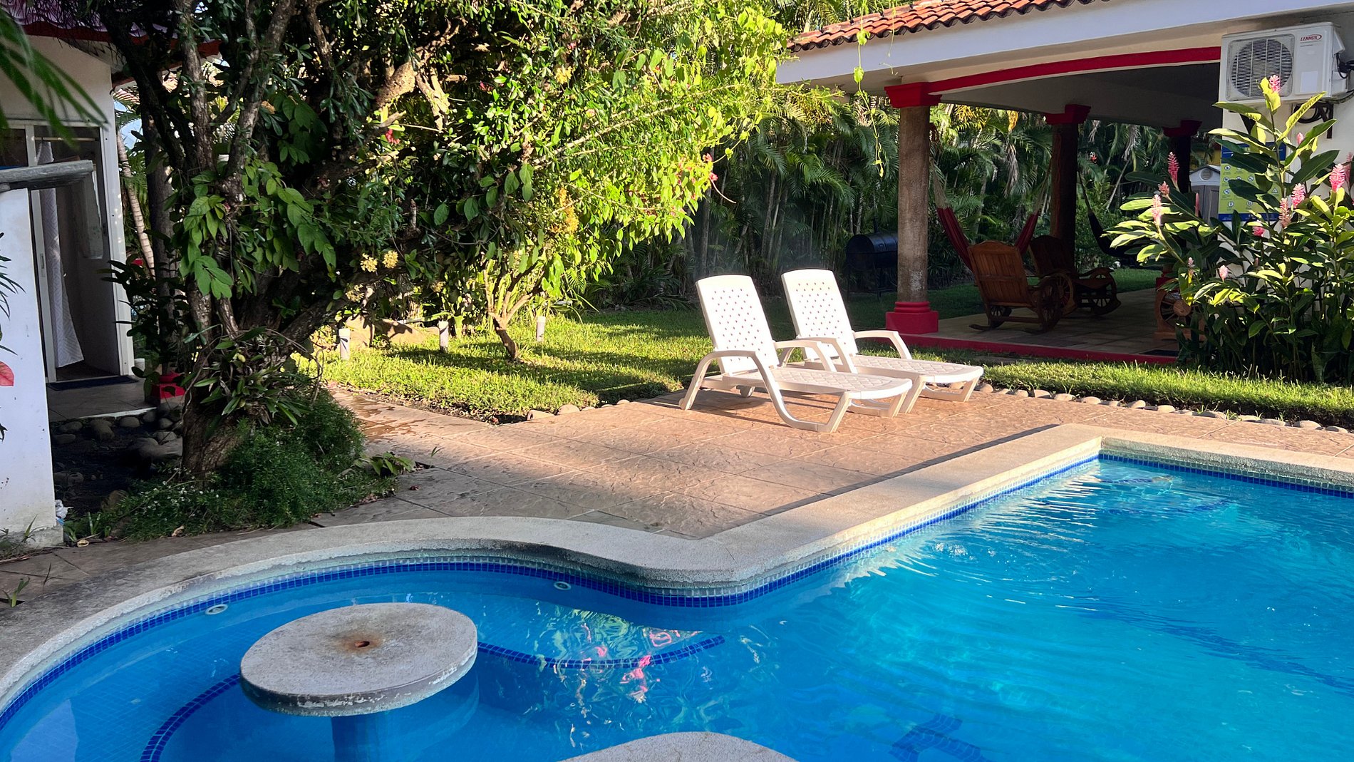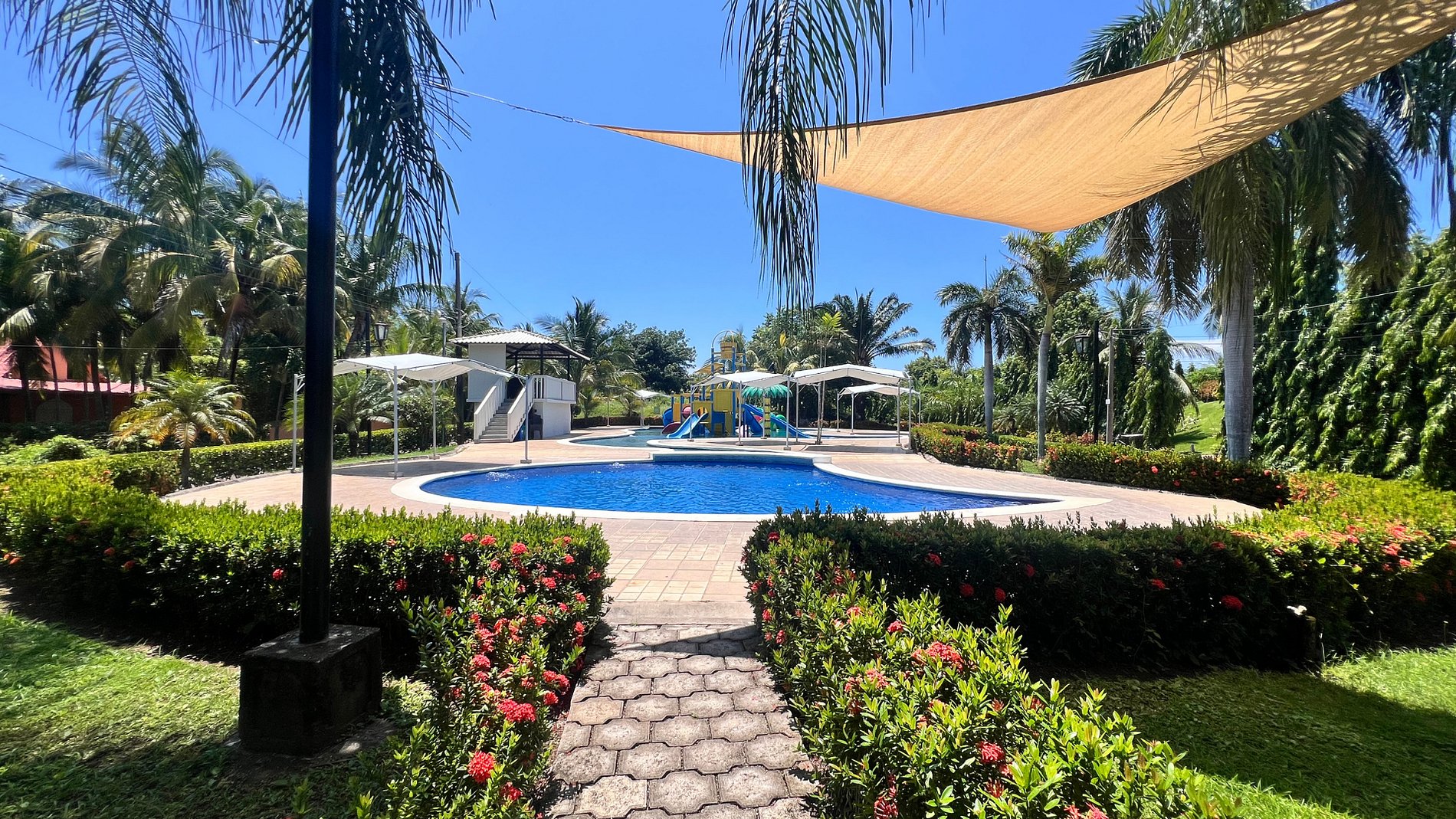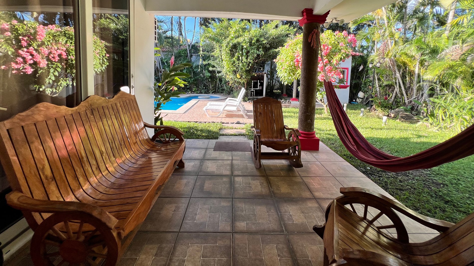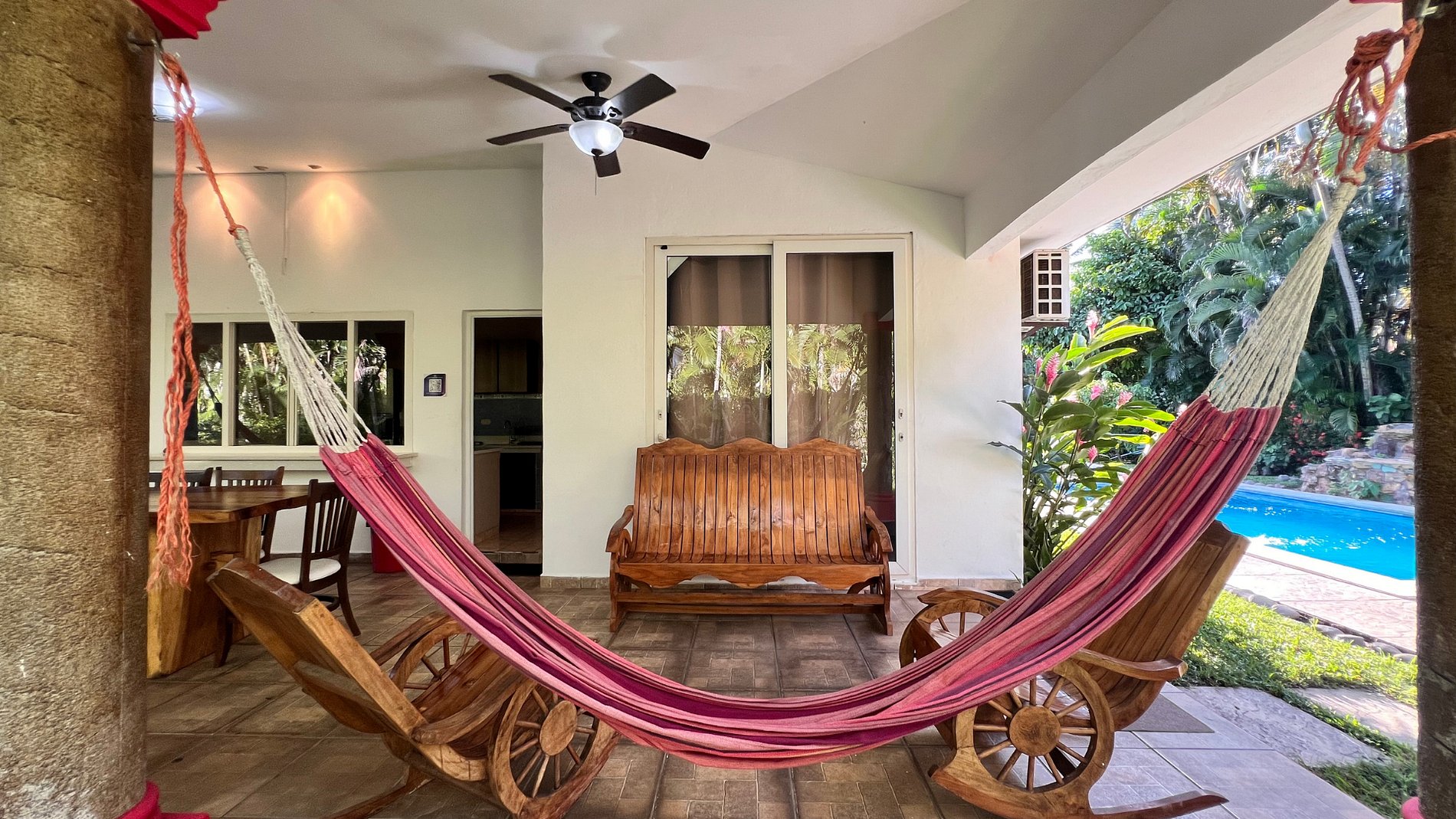 -2 baños, sala, cocina, terraza, jardines, hamacas y piscina.