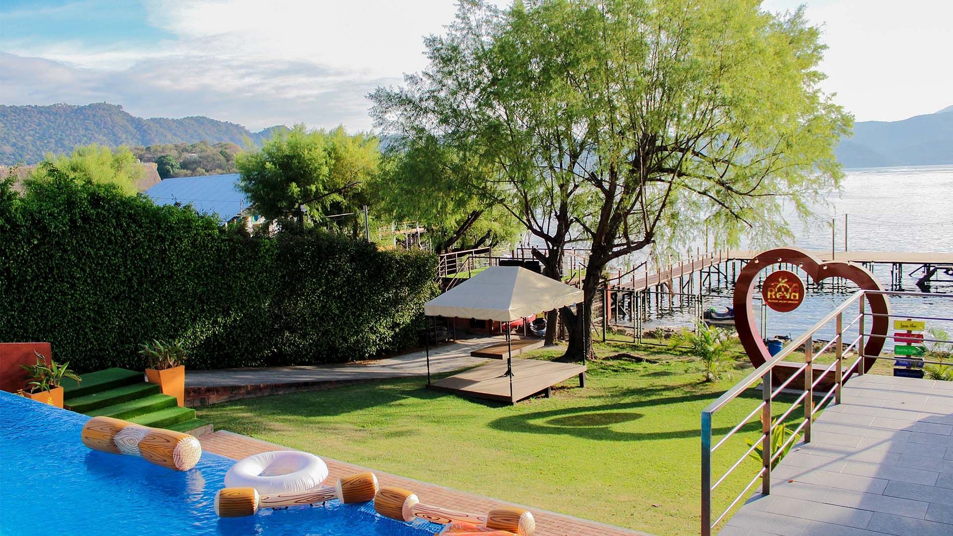 Tiene hermosos jardines, terrazas, muelle y una piscina infinity con una vista increíble al hermoso Lago de Coatepeque.